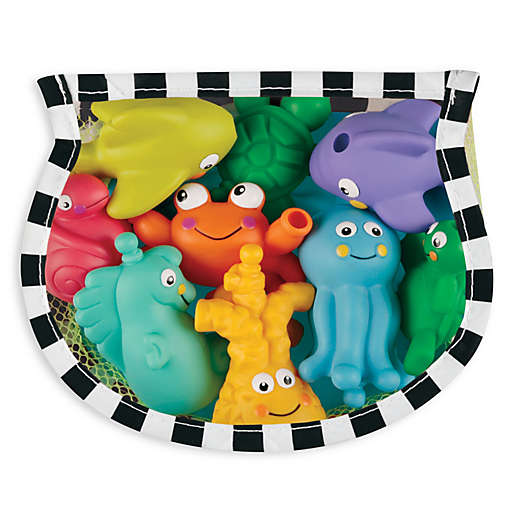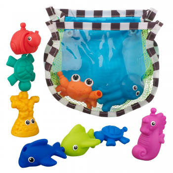 This bathroom set is made up of nine marine creatures that can fit together for one another. They are filled with water and sprayed as you squeeze. The storage bag has a vacuum grip so it can be attached to the wall or bathtub tiles.