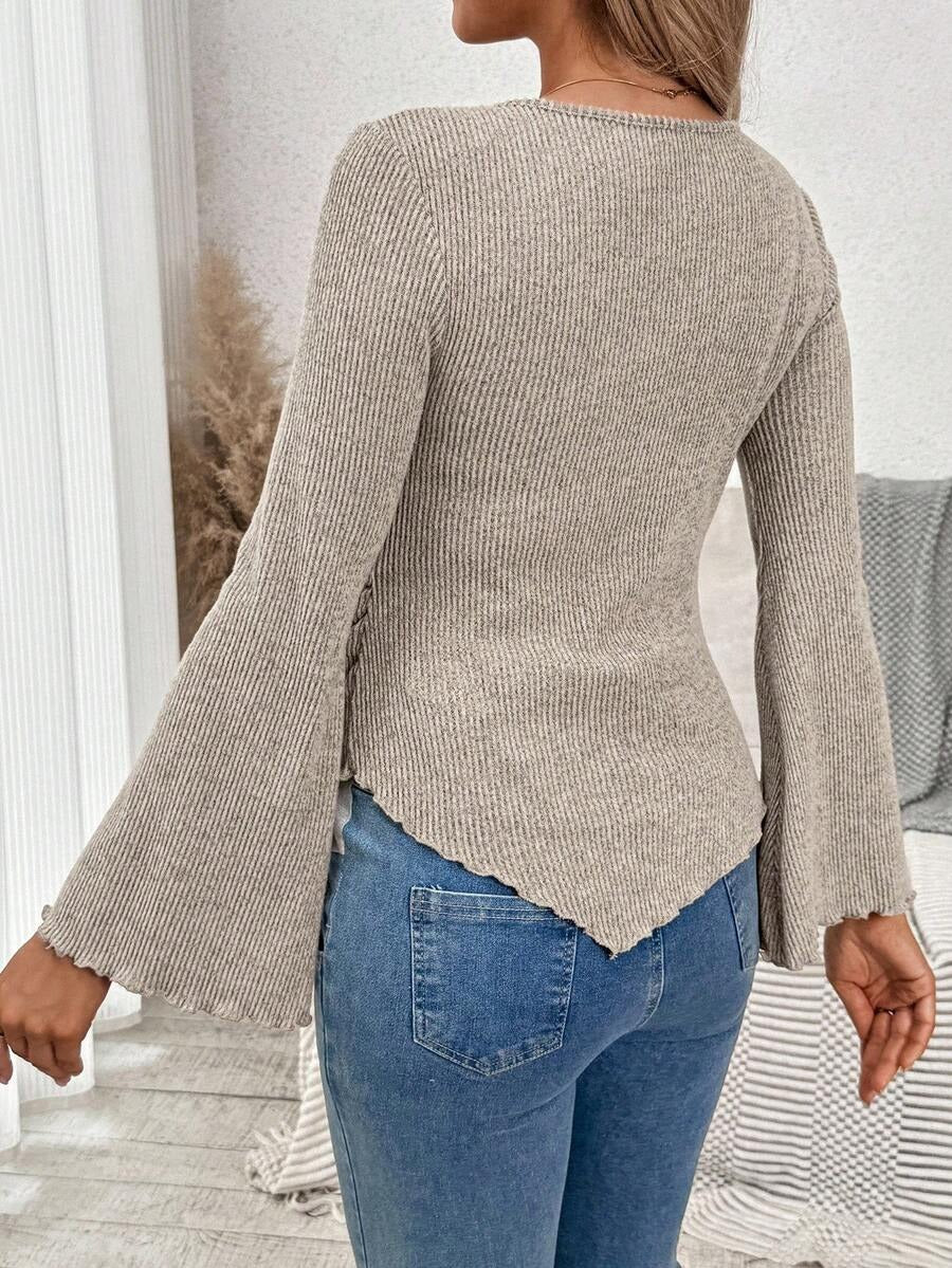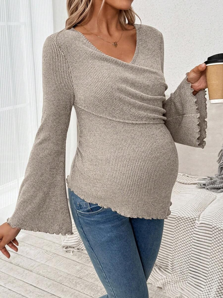 Maternity Solid Color Criss-Cross Wrap Flare Sleeve Ruffle Hem Ribbed T-Shirt Ribbed Maternity Top Maternity Top Bell Sleeves Pregnancy Clothes