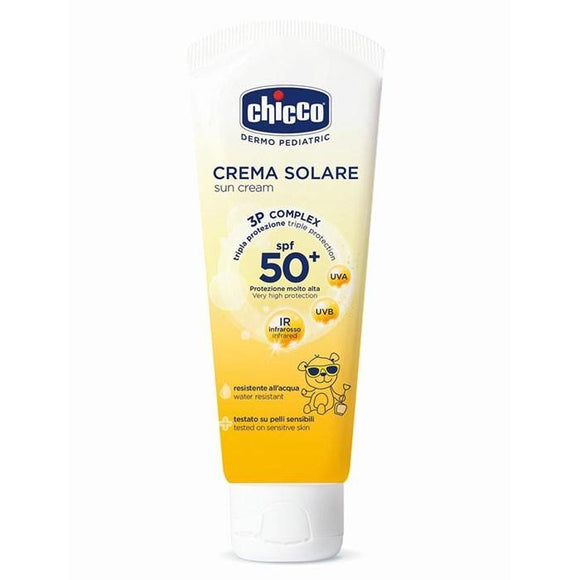 Chicco Sun Cream with very high protection, for sensitive and delicate skin; free from parabens, phenoxyethanol, PEG.