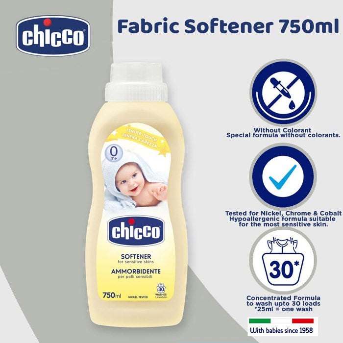 Chicco’s Softners freshen and soften all of baby’s garments taking care of baby's sensitive skin. The natural additives make the fabrics soft and gently perfumed, without damaging fibers or colours. Dermatologically tested, nickel tested, antistatic and biodegradable.