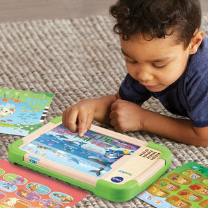 • Includes: 32 touch points per card / 21 activity cards (10 double-sided cards + 1 permanent plug) / 100% ready to play, no downloading required / Storage area located on the back of the tablet for storing activity cards / Sound volume adjustment and automatic shut-off / Works with 2 LR06 batteries included