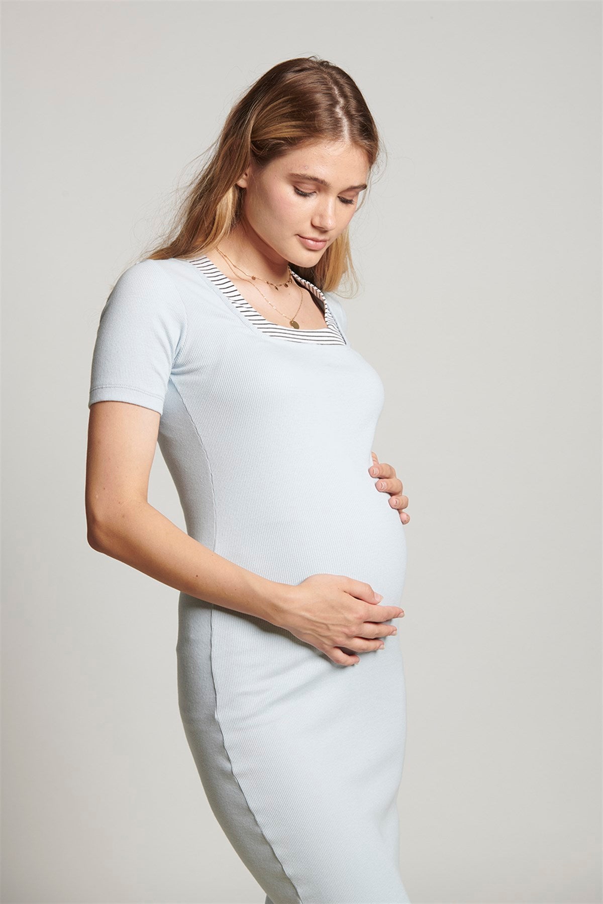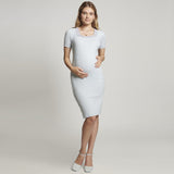 Midi length pencil dress for pregnant women. It is very attractive with its midi length dress model and square neck cut as well as pencil dress form! You can make sporty and stylish combinations with the midi pencil dress, where you can make nice combinations with the striped detail on the collar. It is unlined.