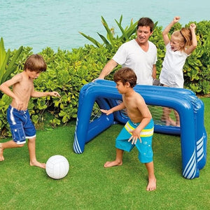The Intex Fun Goals Game is an ideal travel companion for family fun, whether in the water or on land. It comes with anchor bags, an inflatable ball, and the pole base features grommets to add anchor weights if needed. Product Size: 140cm x 89cm x 81cm Suitable for both aquatic and terrestrial play Components: Anchor bags, inflatable ball, grommets for optional weights Comes with a repair patch for easy maintenance